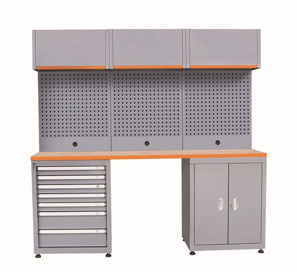 עמדת עבודה כולל עגלת כלים 7 ארון צד, לוח תלייה מחורר ו 3 ארונות איחסון
